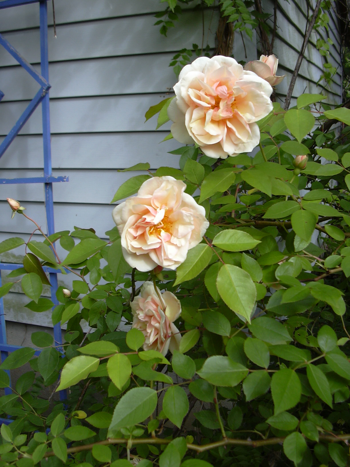 Scaling the garage wall with no encouragement from me. A wild grapevine got there first and provided a scaffold. Roses climb with their thorns, which usually point down toward the roots, except in one species I can’t recall just now.