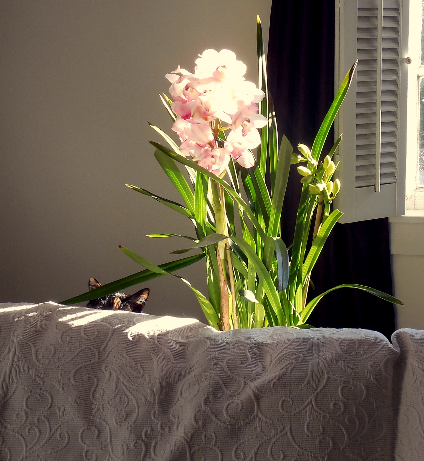 Yet hope springs eternal. Although I’ve pledged never to bring another phaleonopsis into my house, which it will never leave alive, I could not resist this cymbidium on clearance in the local Kroger last week. (Kroger is a more hostile environment for plants than my house, even, so it was the lesser evil. Also I’ve never murdered a cymbidium. Yet).