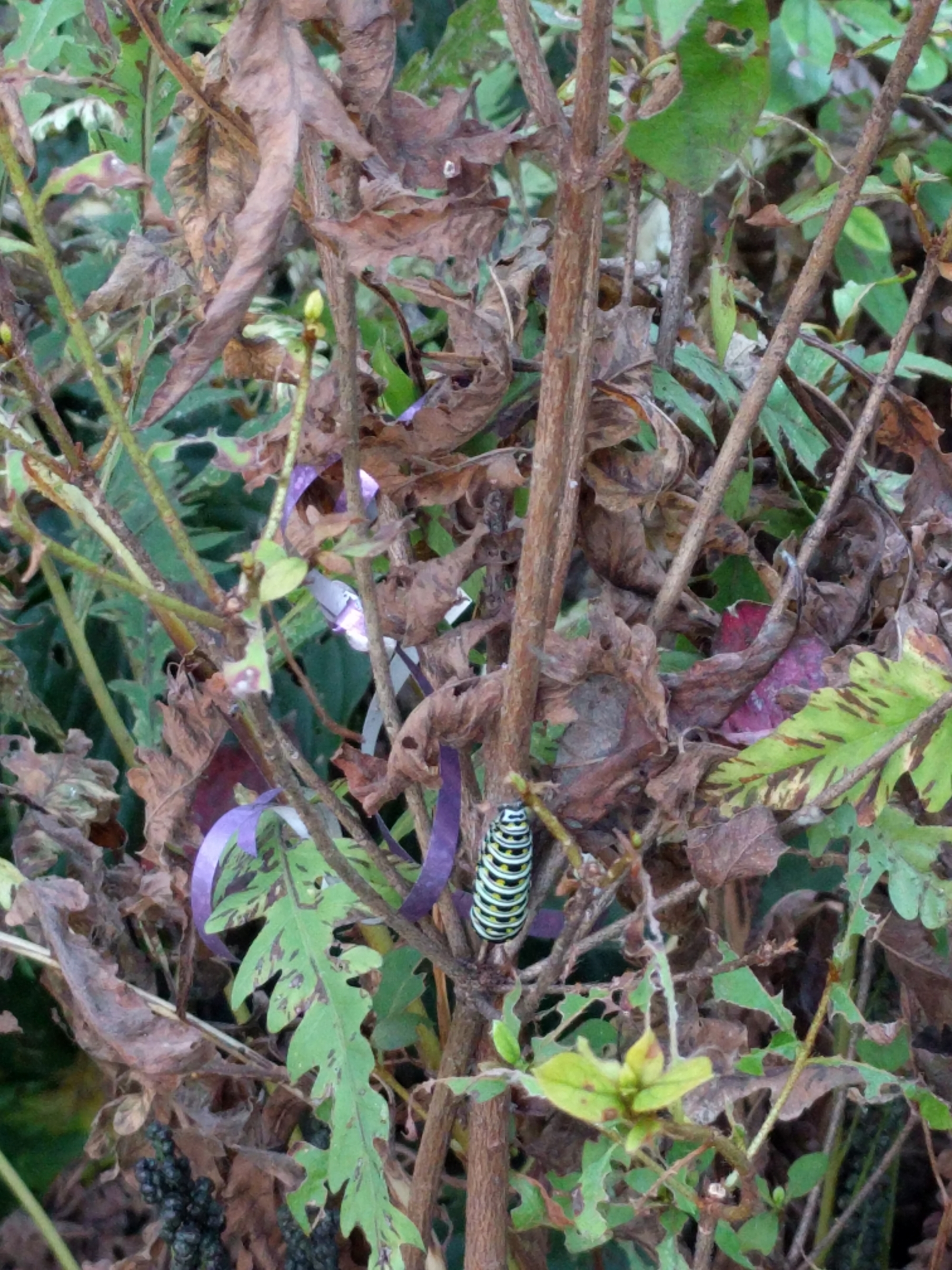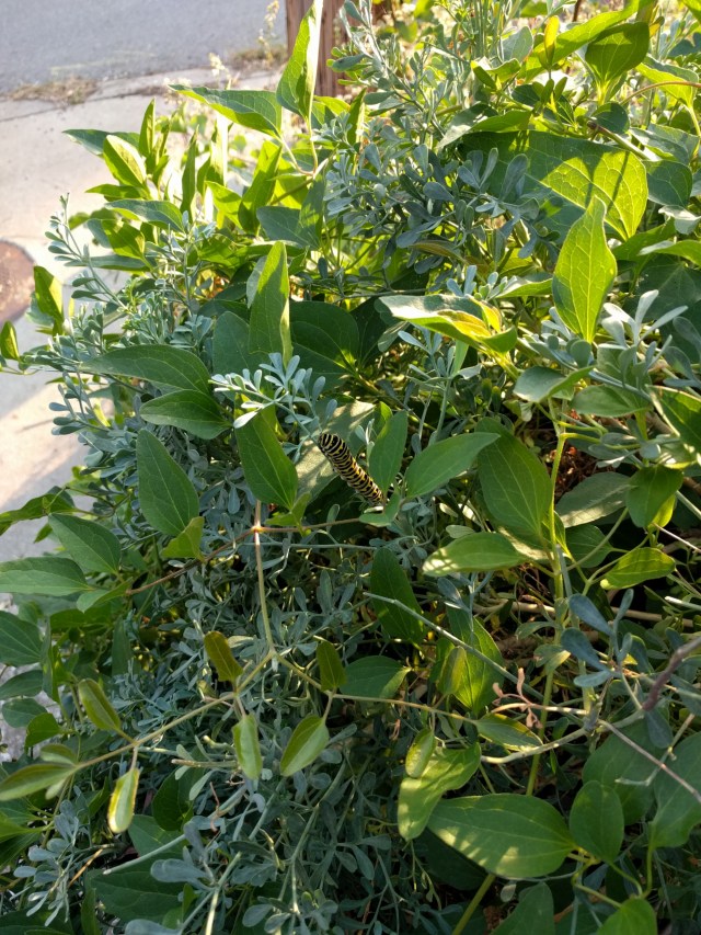Right beneath the lavender ribbon I tied on the azalea to tell the painters not to trample it this spring, I saw this Eastern black swallowtail caterpillar, and I knew he was getting ready to pupate. His body language is completely different from when they’re pigging out on parsley or, in his case, rue. He’s very straight and compact and — not eating. For a caterpillar, “not eating” is not an option.